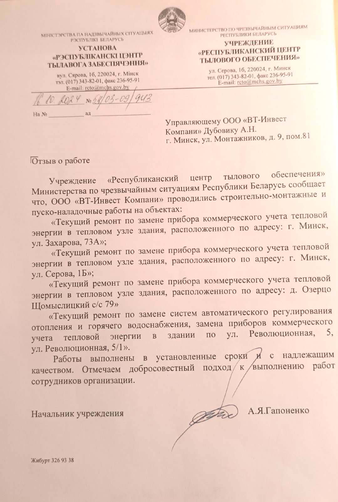 "Персонал ООО "ВТ-Инвест Комапани" зарекомендовал себя как надежный деловой партнер и квалифицированный подрядчик при выполнении работ по замене приборов учета тепловой энергии в УЗ "4-я ГКБ им. Н.Е. Савченко"
